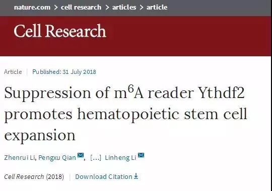 Linheng Li etc. Suppression of m6A reader Ythdf2 promotes hematopoietic stem cell expansion. Cell Research, 2018; DOI: 10.1038/s41422-018-0072-0
