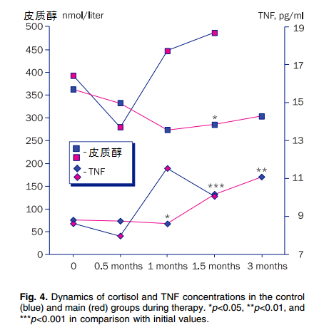 治疗组和对照组的TNF、IL-1p、IL-2和IL-6的初始水平也在正常范围内,无统计学差异。在治疗第6周和第3个月,治疗组细胞因子水平增加(除了IL-1B),具有统计学意义。这可以解释为脐带血细胞释放了有效物质。