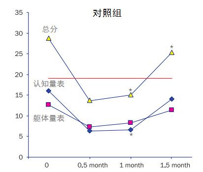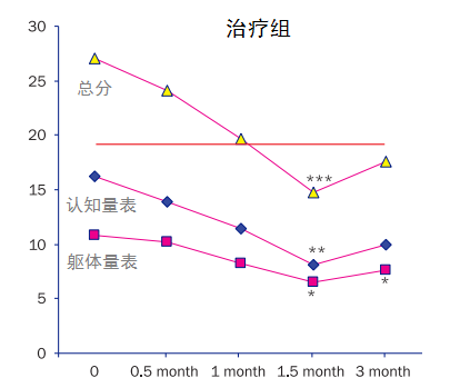 3个月内,治疗组评分略有反弹,但仍在中度抑郁对应的范围内。而在对照组中,Beck评分在6周时就回到了初始水平。